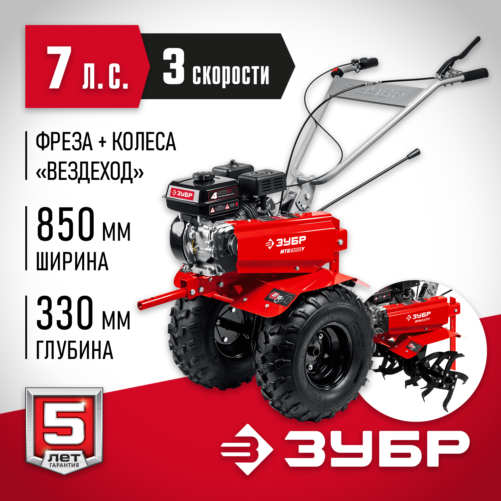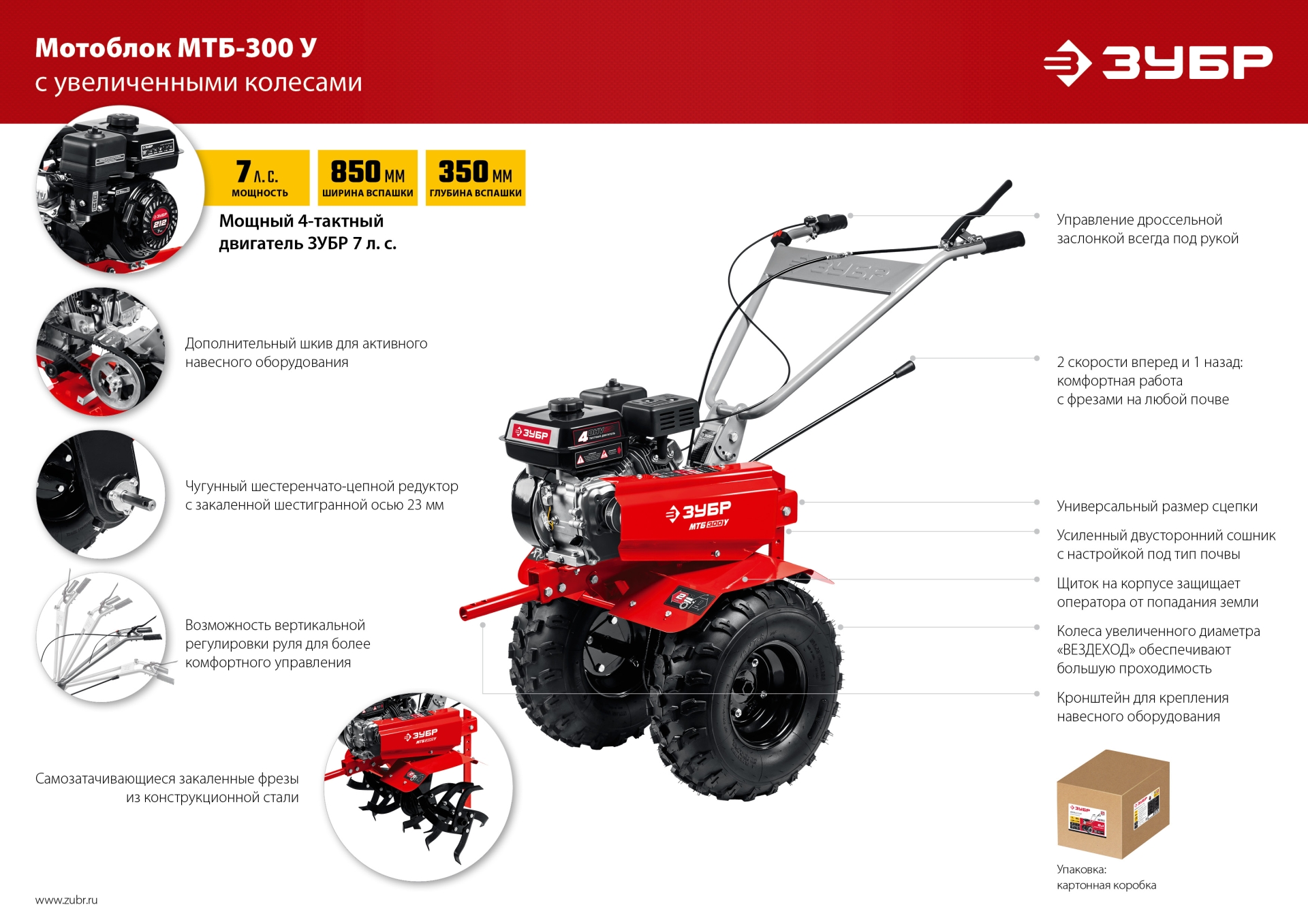 - 2 скорости вперед (основная и повышающая) и 1 назад позволяют комфортно работать на любых типах почвы