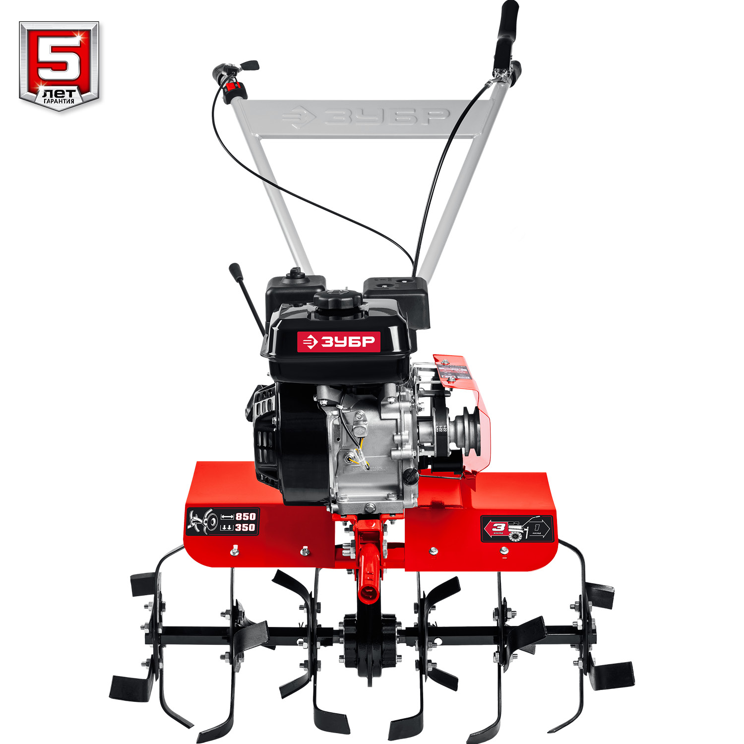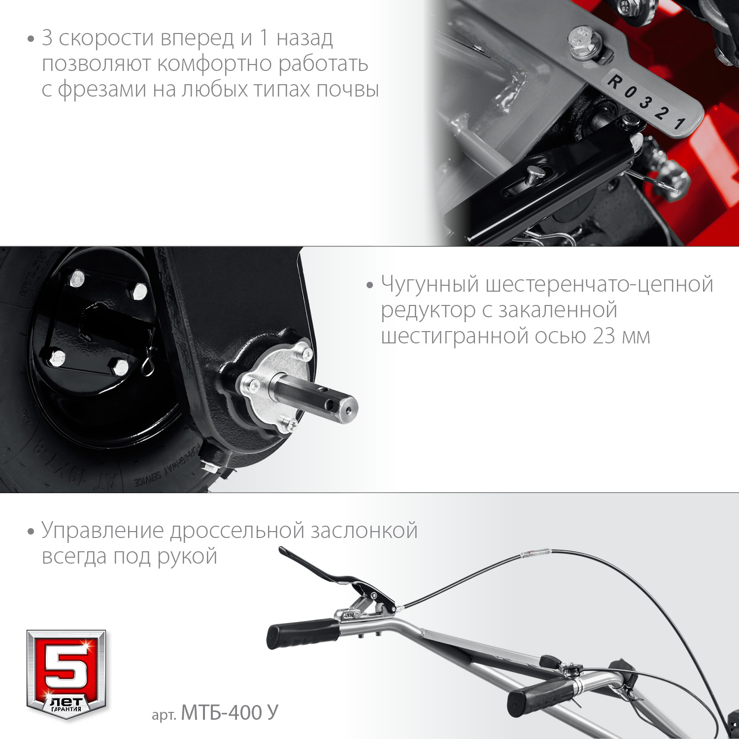 - 3 скорости вперед (понижающая, основная и повышающая) и 1 назад позволяют комфортно работать на любых типах почвы