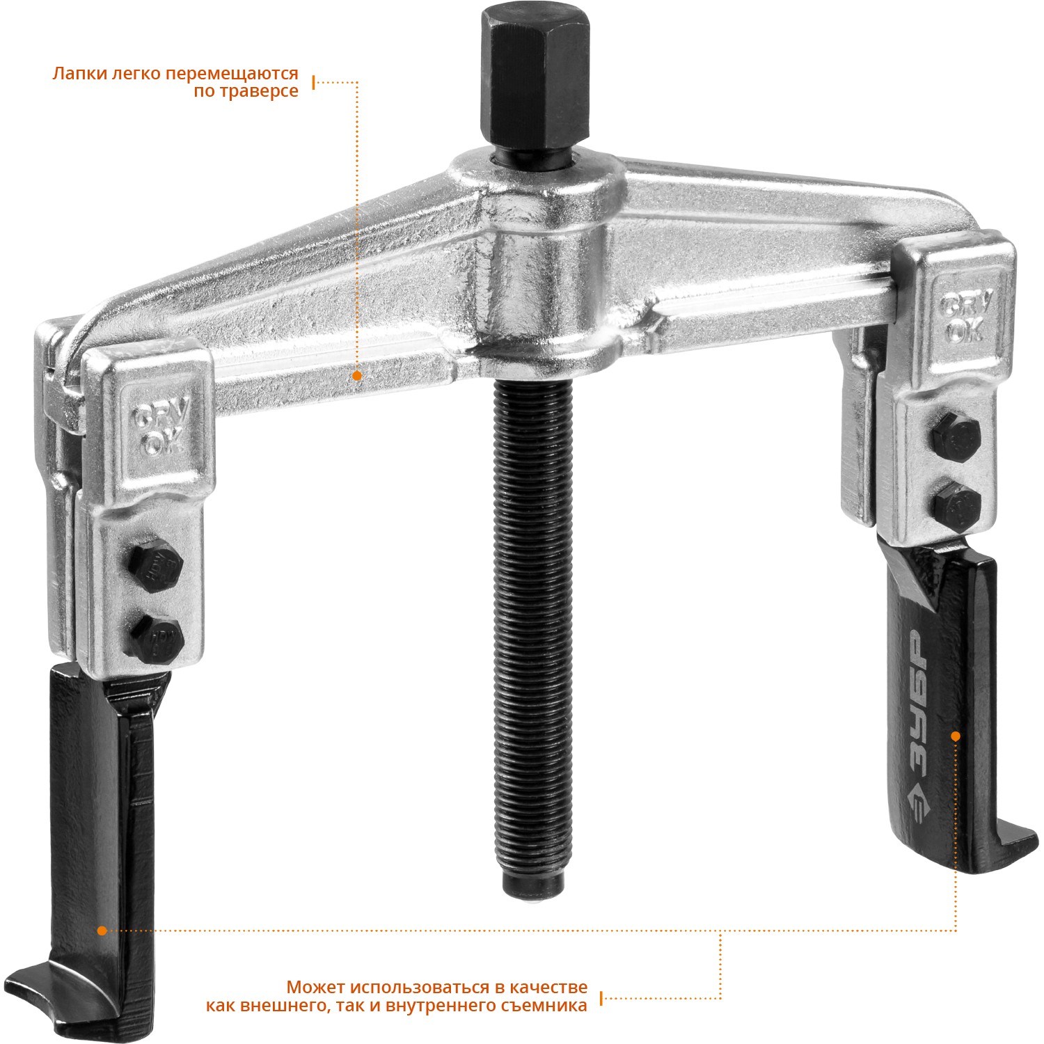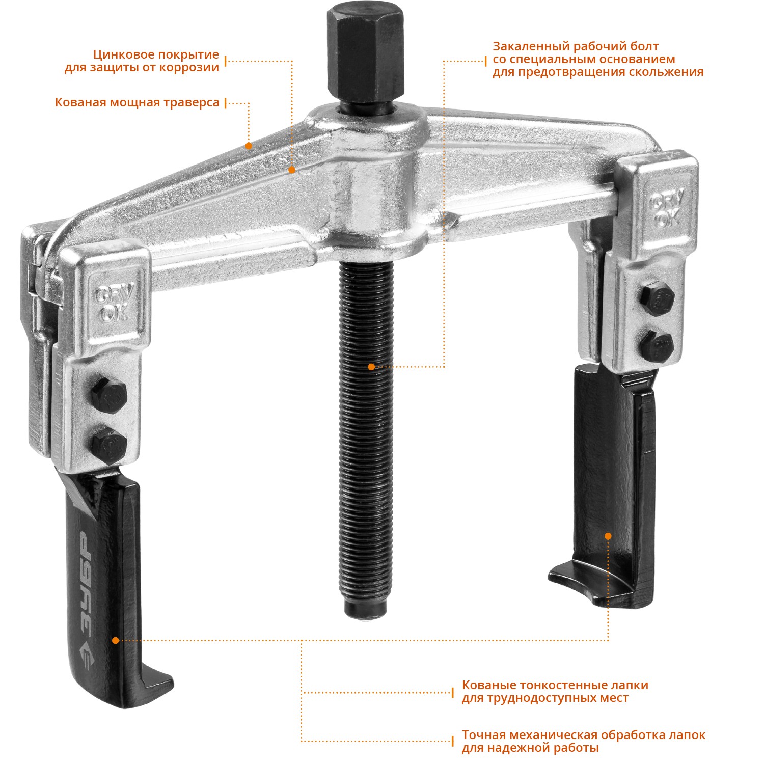 Захваты съемника выкованы из качественной инструментальной стали, что обеспечивает долгий срок службы при работе с высокими нагрузками. Позволяет работать с широким рядом узлов. Уменьшенные по толщине захваты дают возможность работать в условиях ограниченного пространства.