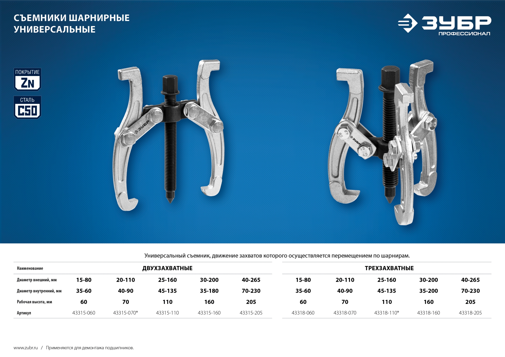 ЗУБР внешний d 40 - 265 мм, внутренний d 70 - 230 мм, шарнирный двухзахватный съемник, Профессионал (43315-205)