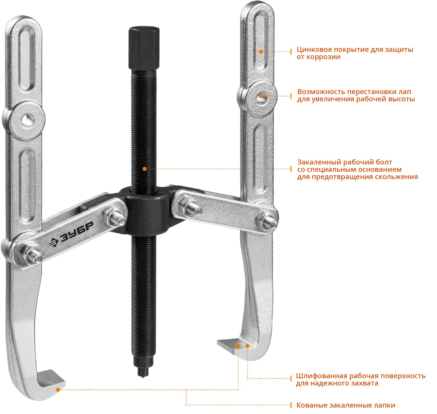 Захваты съемника выкованы из качественной инструментальной стали, что обеспечивает долгий срок службы при работе с высокими нагрузками. Позволяет работать с широким рядом узлов