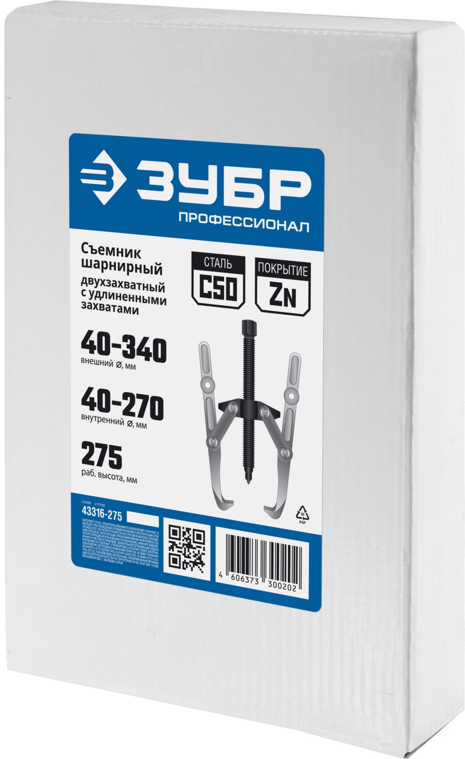 ЗУБР внешний d 40 - 340 мм, внутренний d 40 - 270 мм, шарнирный двухзахватный съемник с удлиненными захватами, Профессионал (43316-275)