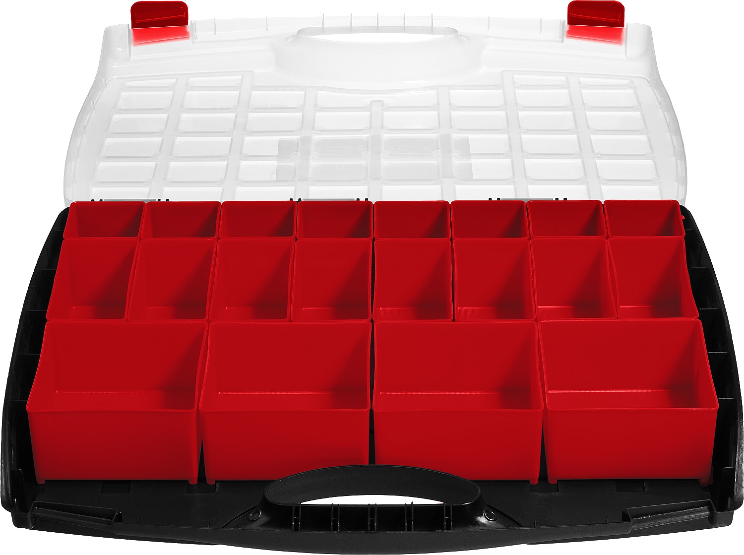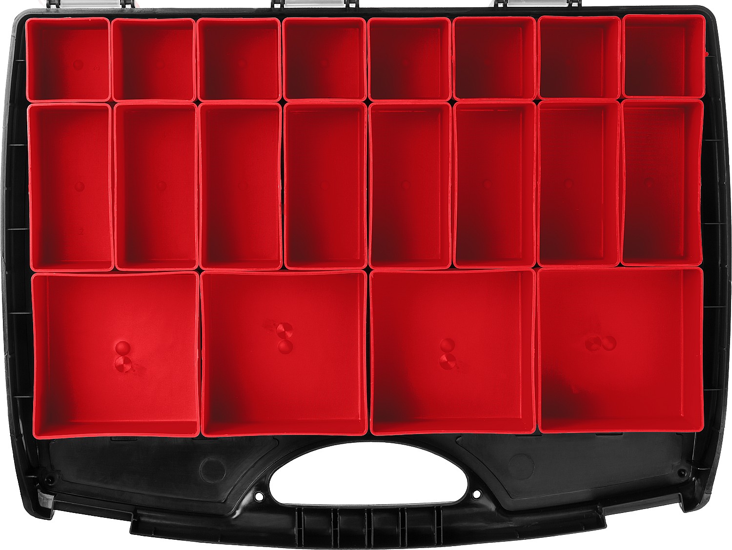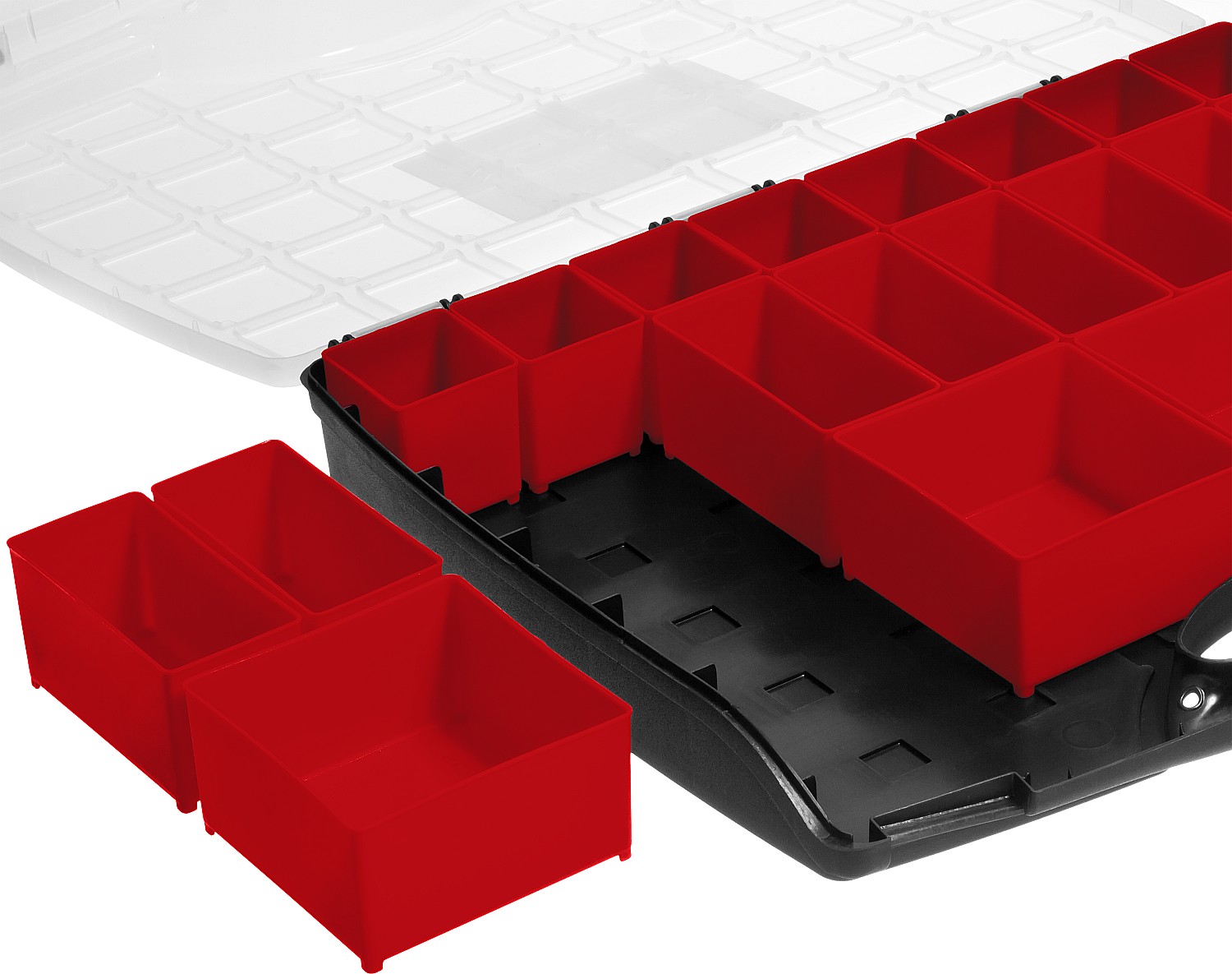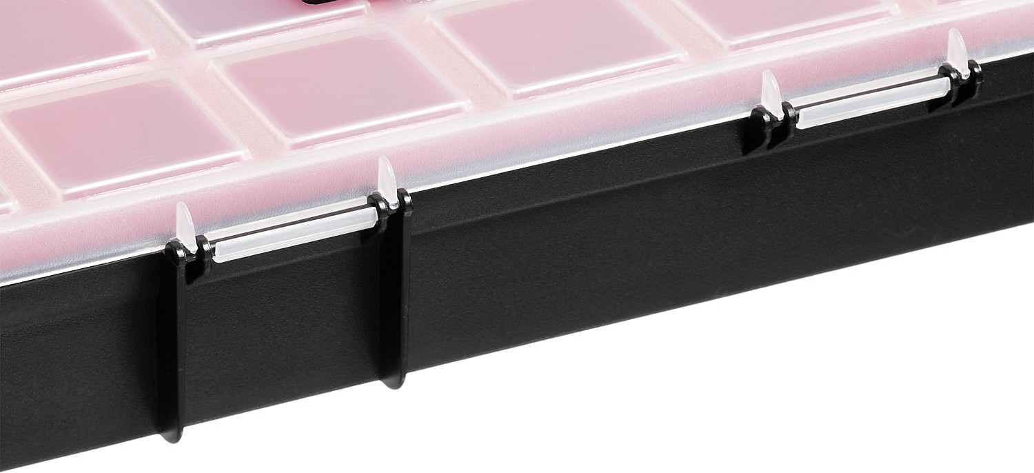 Съемные лотки органайзера позволяют организовать удобное хранение и переноску принадлежностей к ниструментам