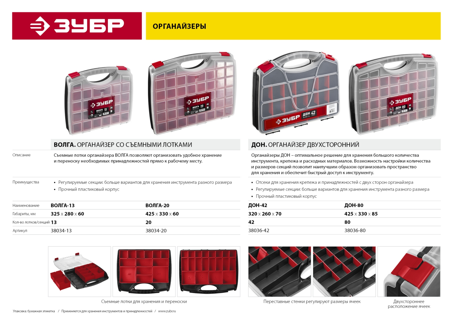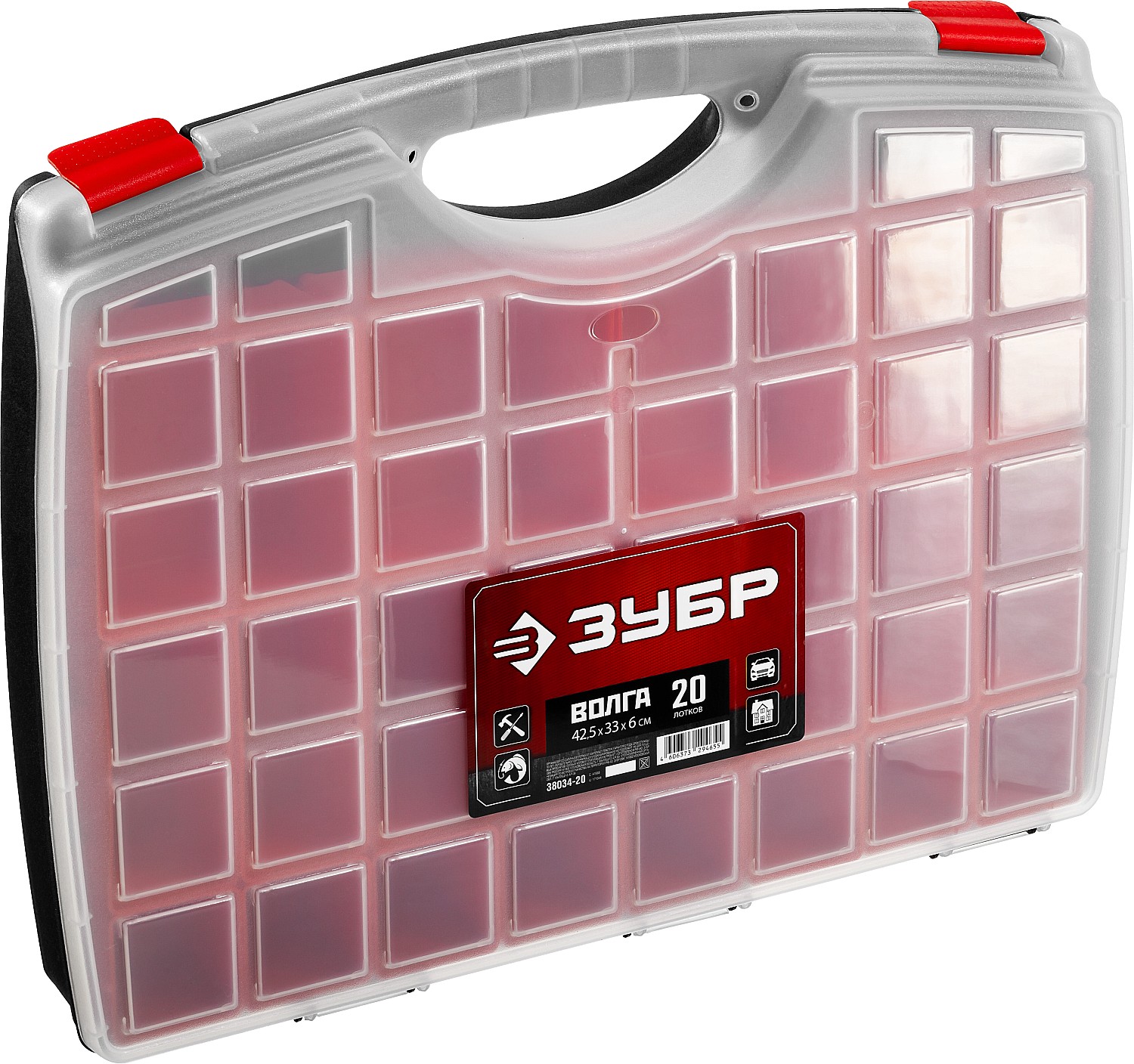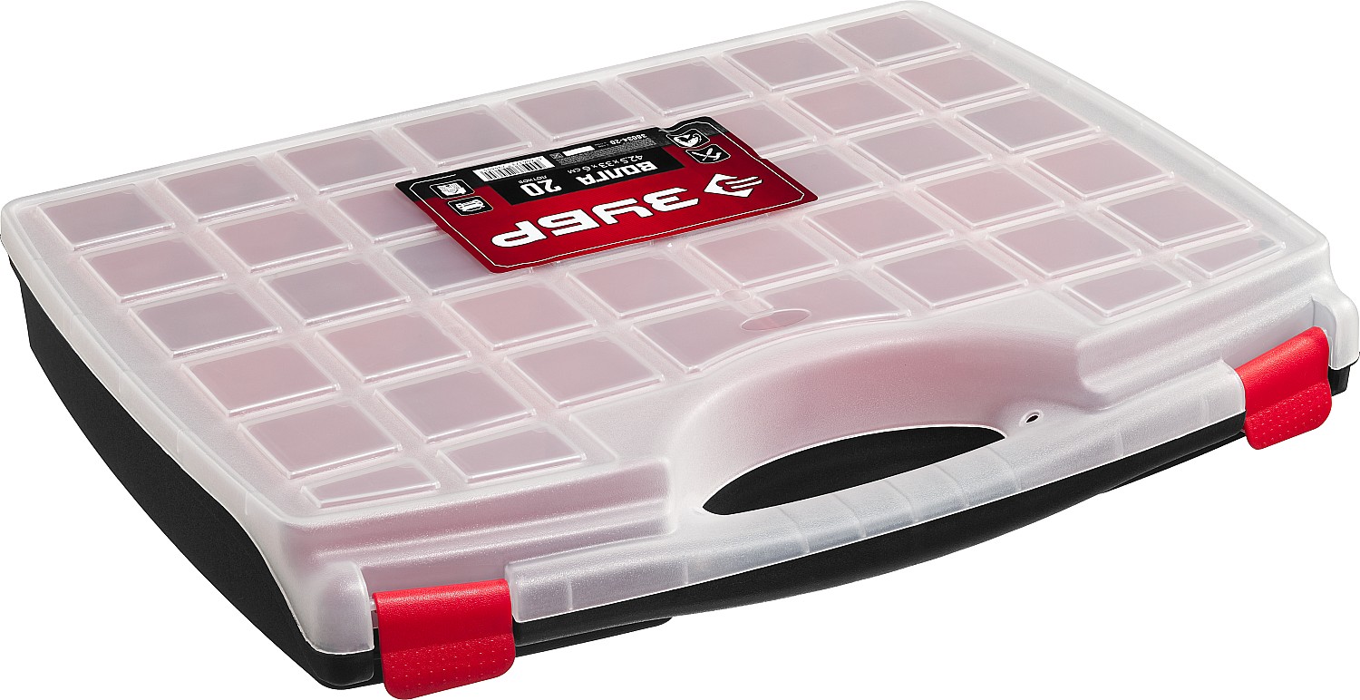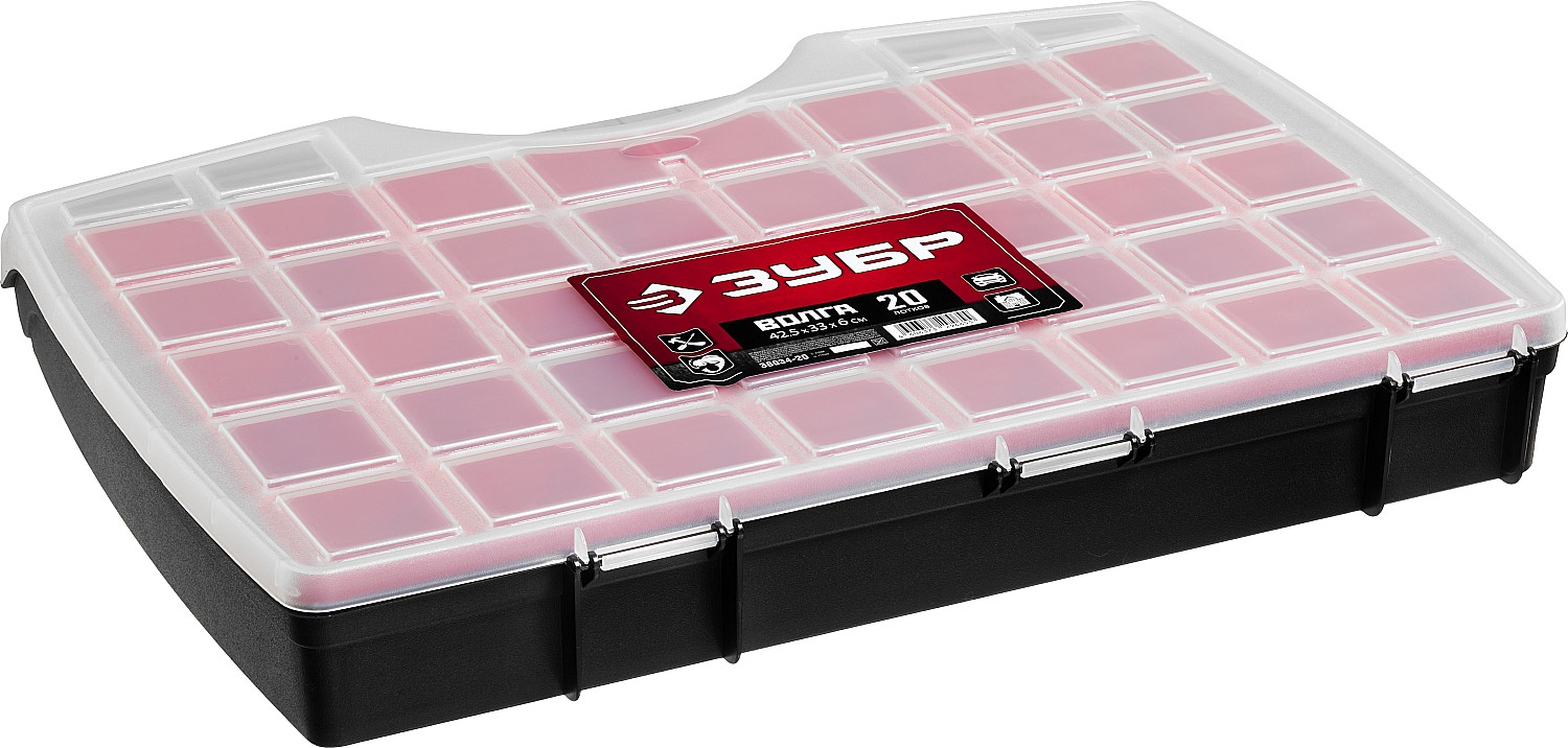 ЗУБР ВОЛГА-20, 425 х 330 х 60 мм, пластиковый органайзер с 20 съемными лотками (38034-20)