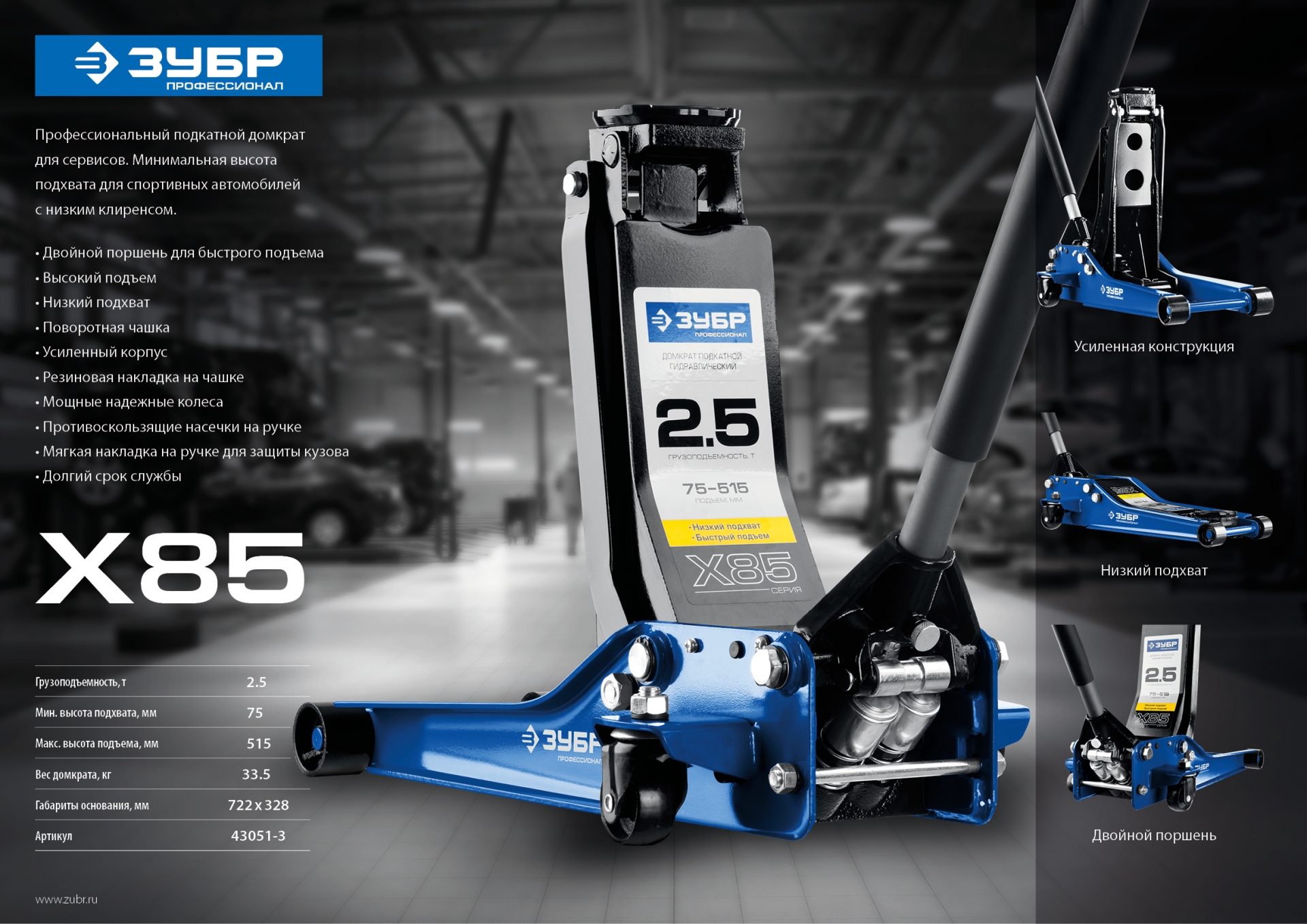 - Низкая высота подхвата для автомобилей с небольшим клиренсом