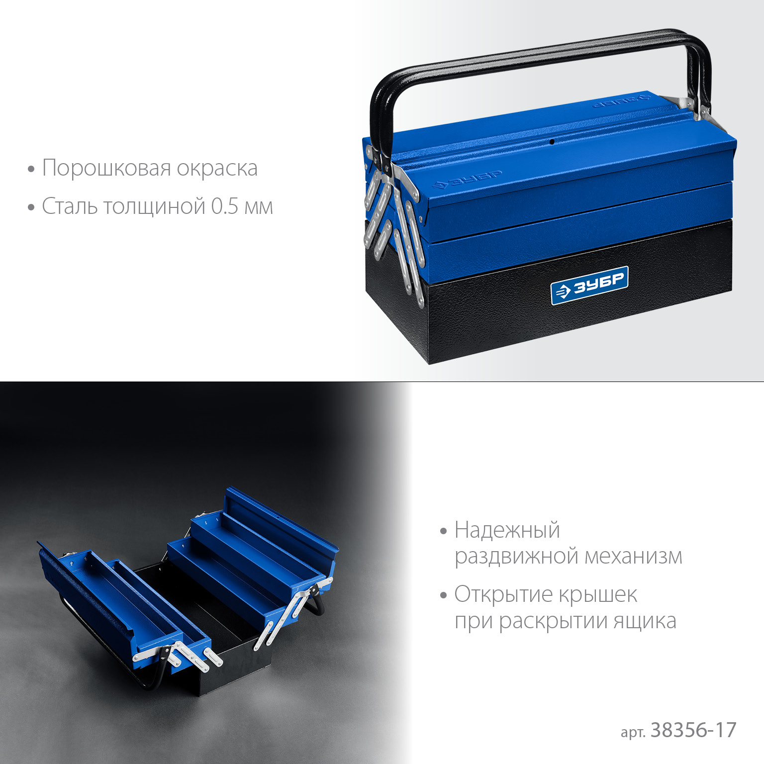 Пять секций для компактного и удобного хранения и транспортировки различного ручного инструмента.