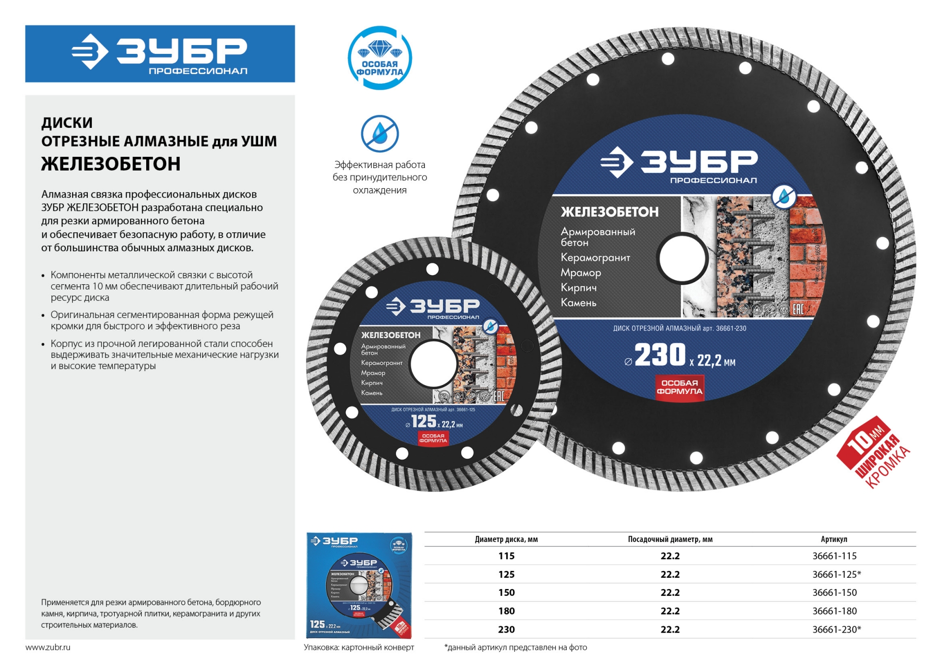 Исключительно высокий уровень качества отрезных алмазных дисков ЗУБР гарантирован комплексной системой контроля всего процесса производства: от качества поступающего сырья до готовой продукции. Корпуса алмазных дисков изготовлены из прочной легированной стали, способной выдержать значительную механическую нагрузку и высокую температуру.
