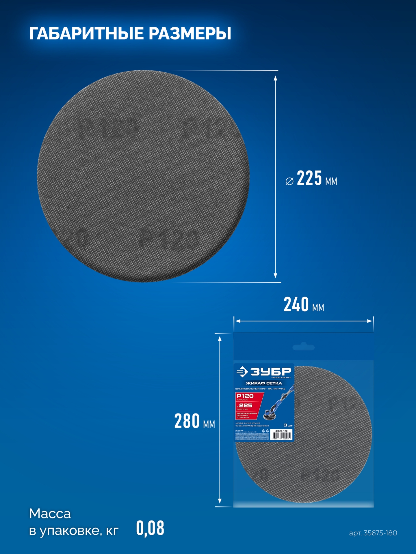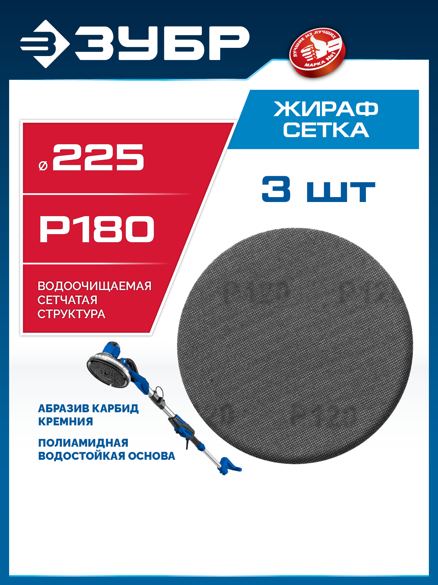 ЗУБР Жираф СЕТКА 225 мм, Р180, сетчатый шлифовальный круг на липучке, 3 шт., Профессионал (35675-180)