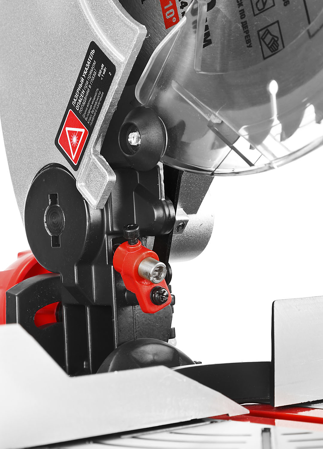 - Фиксирующийся в любом положении поворотный стол и удобная регулировка наклона облегчают установку угла пиления