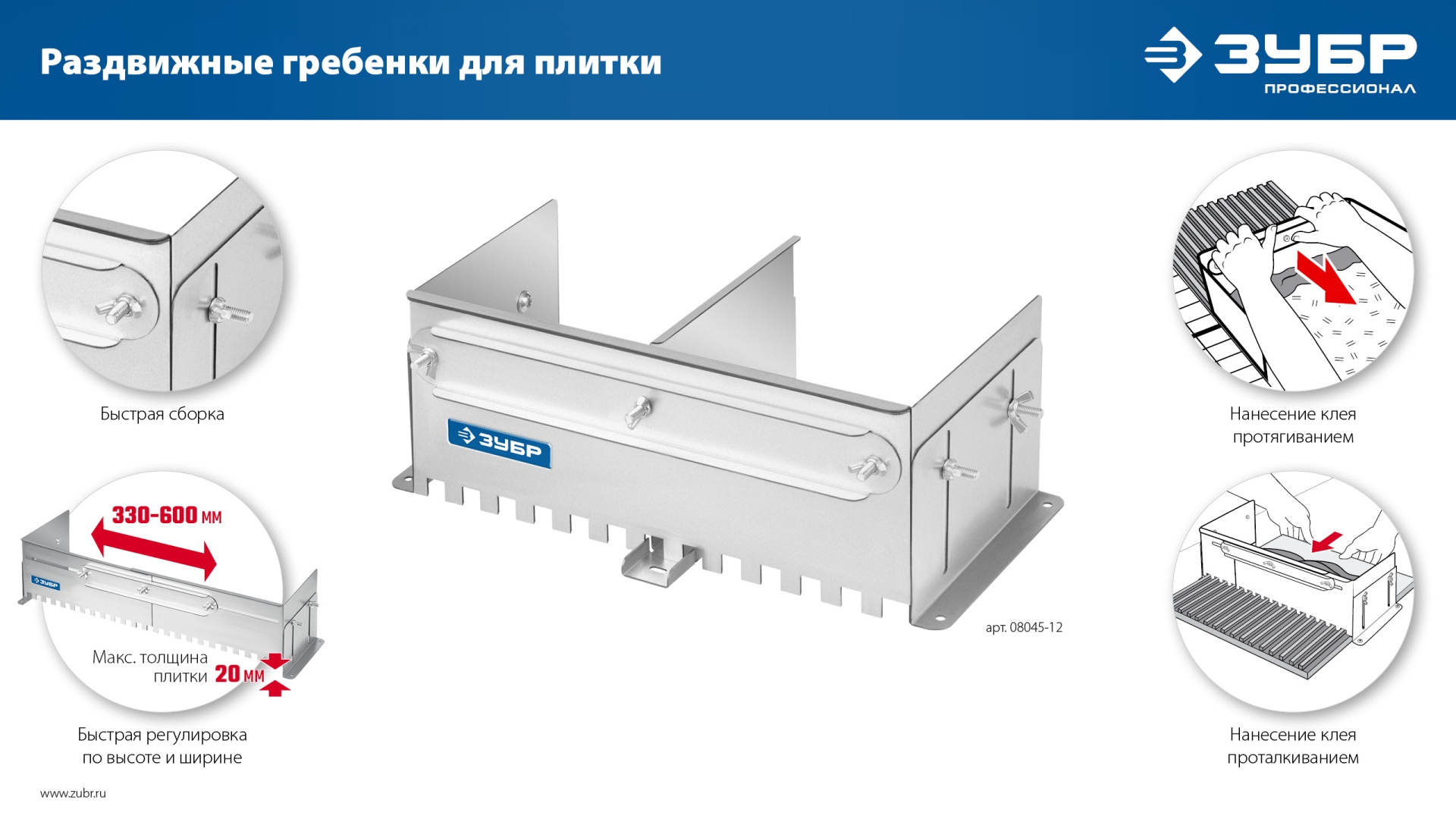 Предназначена для быстрой работы с большим объемом работ по укладке плитки шириной до 600мм Сделана изоцинкованной стали, благодаря которой гребенка не заржавеет и прослужит максимально долго. Имеет величину зуба 12мм. Боковые регуляторы помогут закрепить гребенку на рабочей поверхности и настроить её по высоте под любую плитку. В комплекте имеется дополнительная секция, благодаря которой гребенку можно использовать даже с самыми узкими плитками. Легко моется, не боится влаги.